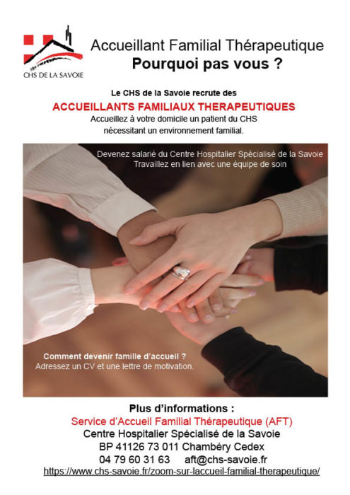 Au CHS de la Savoie, une dizaine d’accueillants familiaux accueillent entre 20 et 25 patients et sont soutenus par une équipe pluridisciplinaire dédiée ( psychologue coordinatrice, infirmiers, cadre, secrétaire, assistante sociale…).