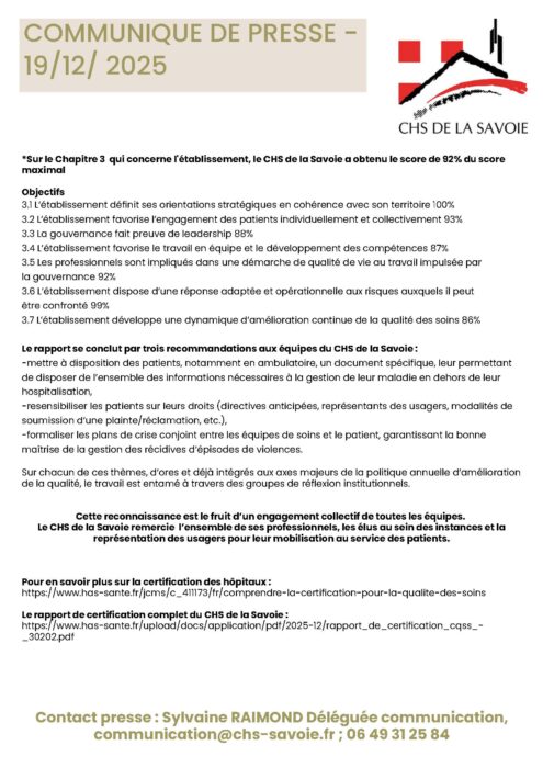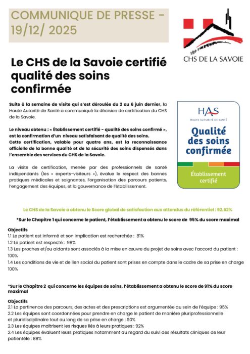 Le CHS de la Savoie certifié qualité des soins confirmée
